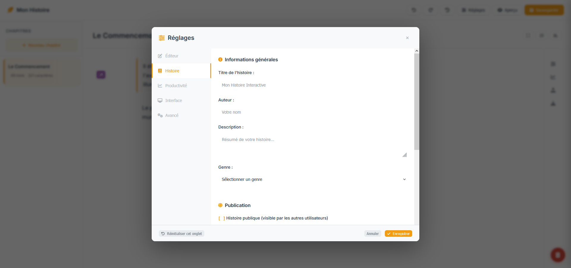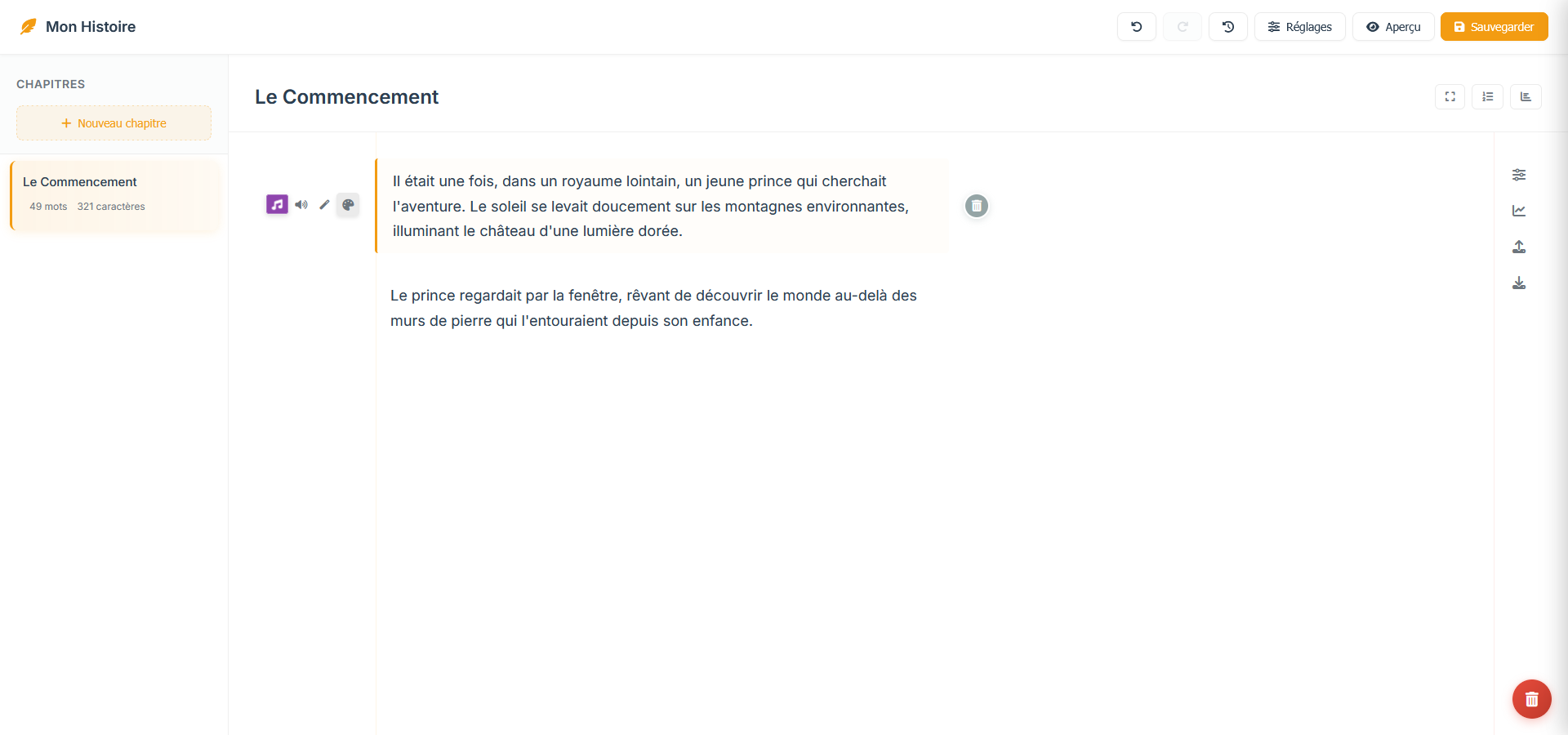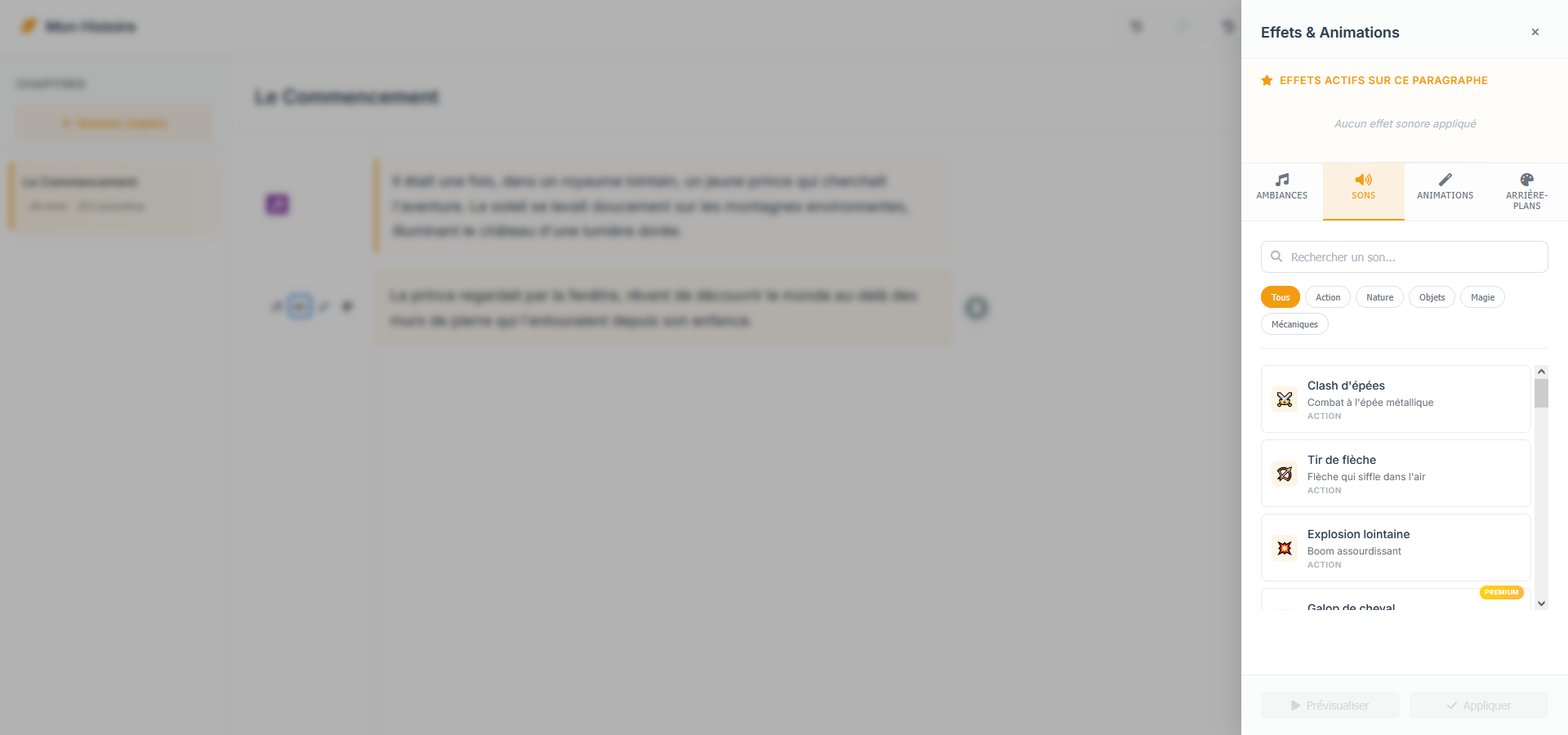 Placez une ambiance en choisissant le paragraphe de début et de fin, ajoutez des sons pour marquer les évènements de votre histoire, animez certains mots et changez l'arrière‑plan sur une scène. Visualisez le rendu en un clic, exactement comme vos lecteurs le vivront !